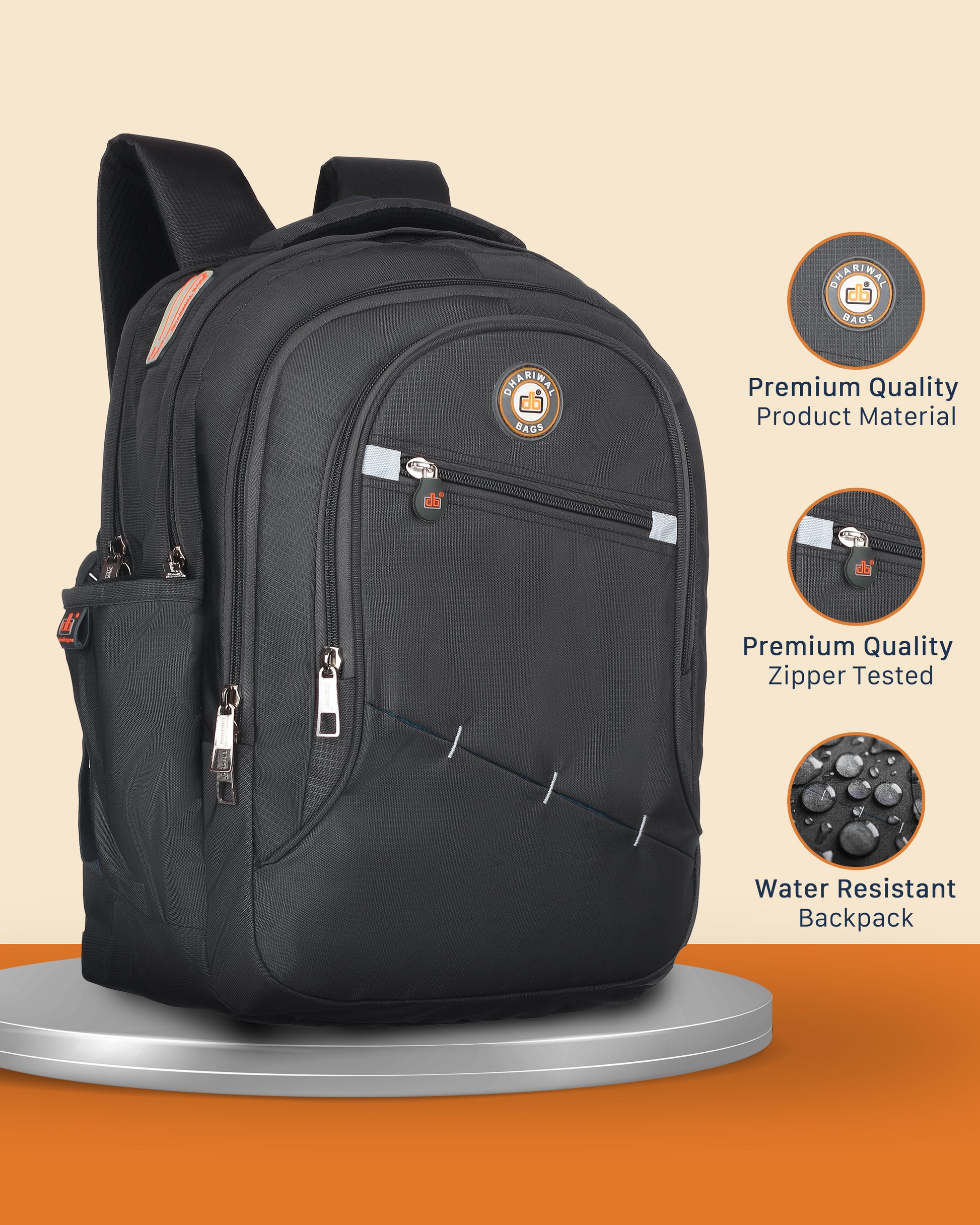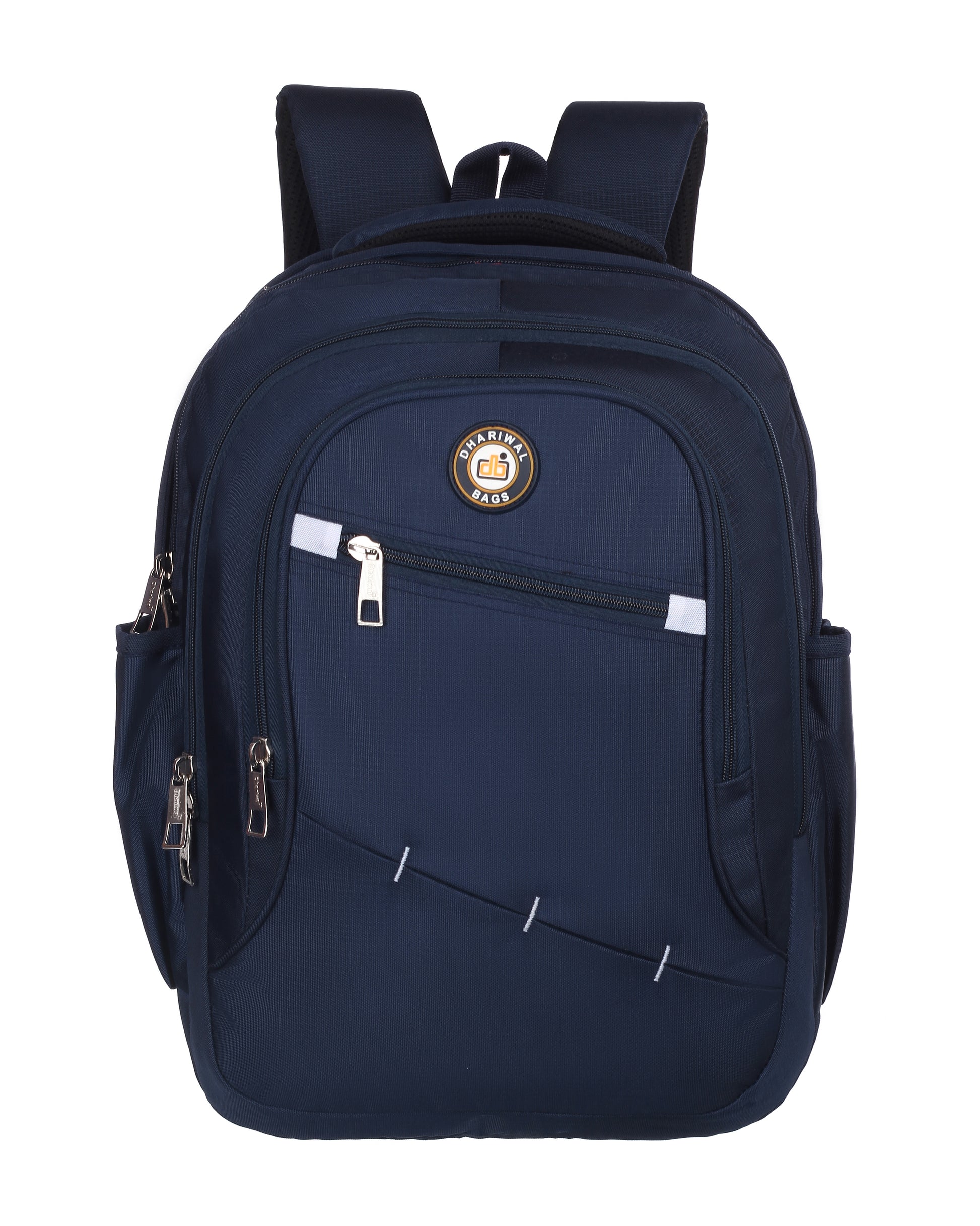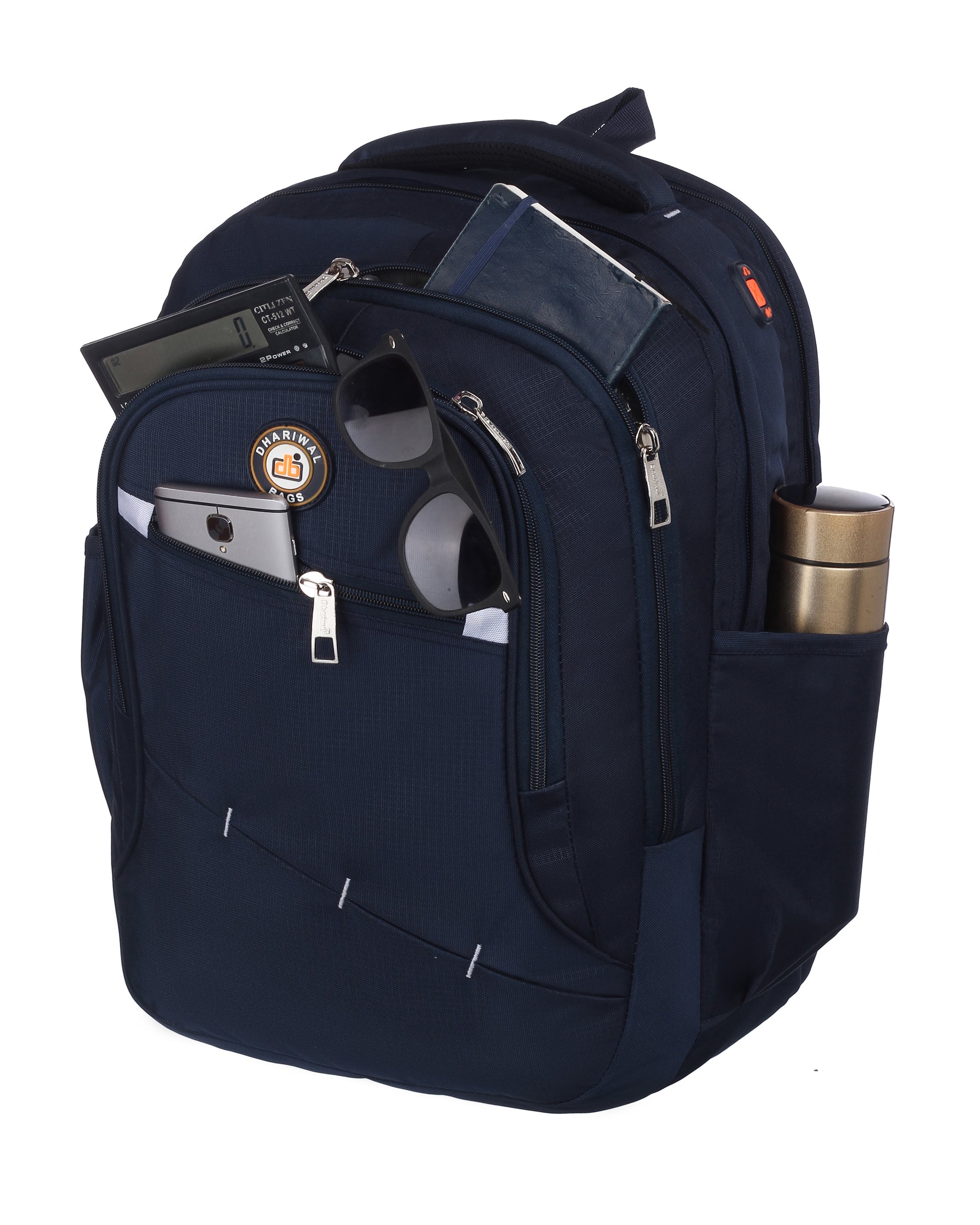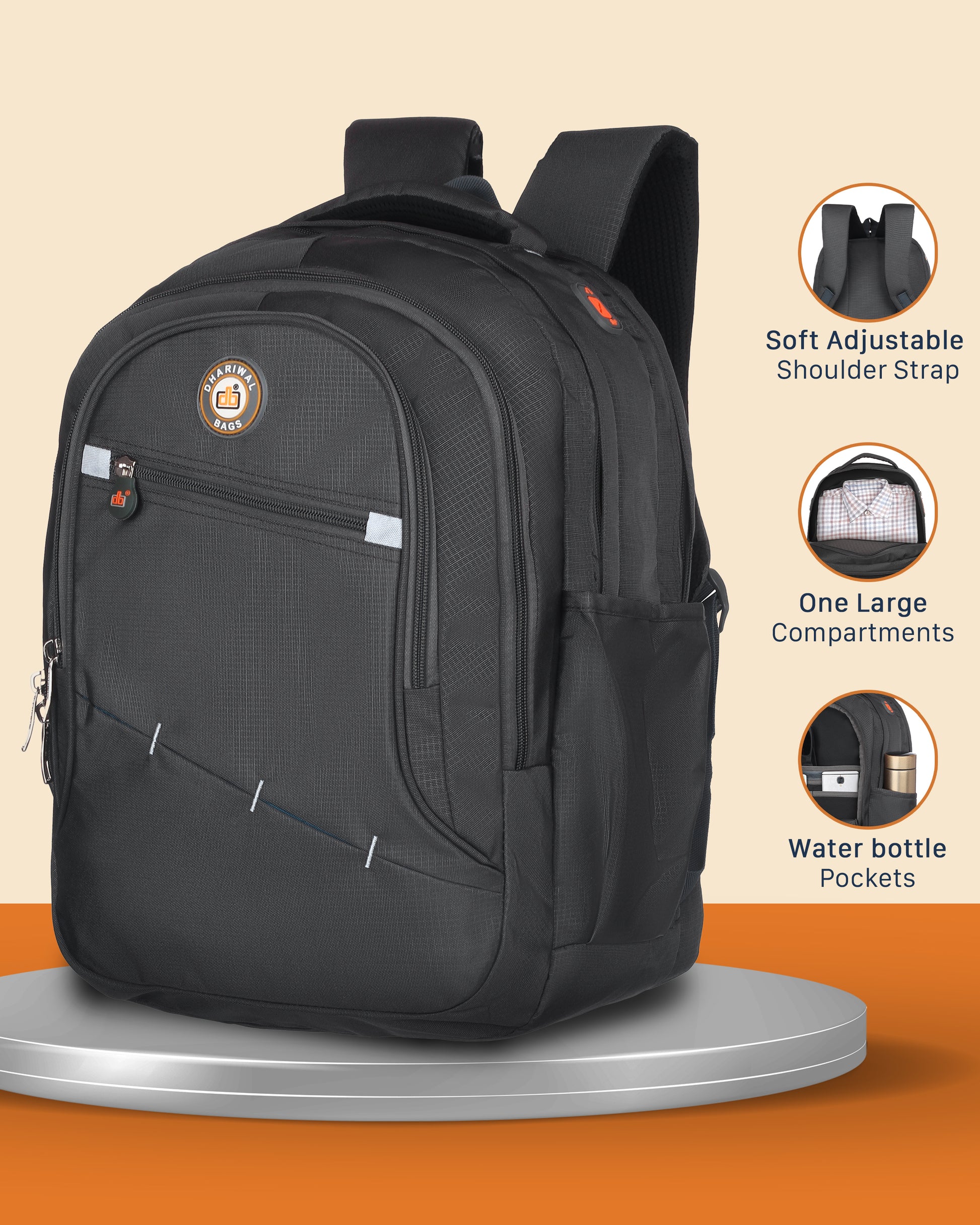Dhariwal Unisex Dual Compartment Laptop Backpack With Rain Cover 43L BP-253 is Lightweight and spacious laptop backpack with 2 compartments and 3 front easy-access pockets. One compartment is for carrying a laptop inside. Another compartment has an organizer for pens, visiting cards, etc along with space for carrying papers, files, etc. It has provision for holding bottles on both sides and has padded shoulder straps for your comfort.