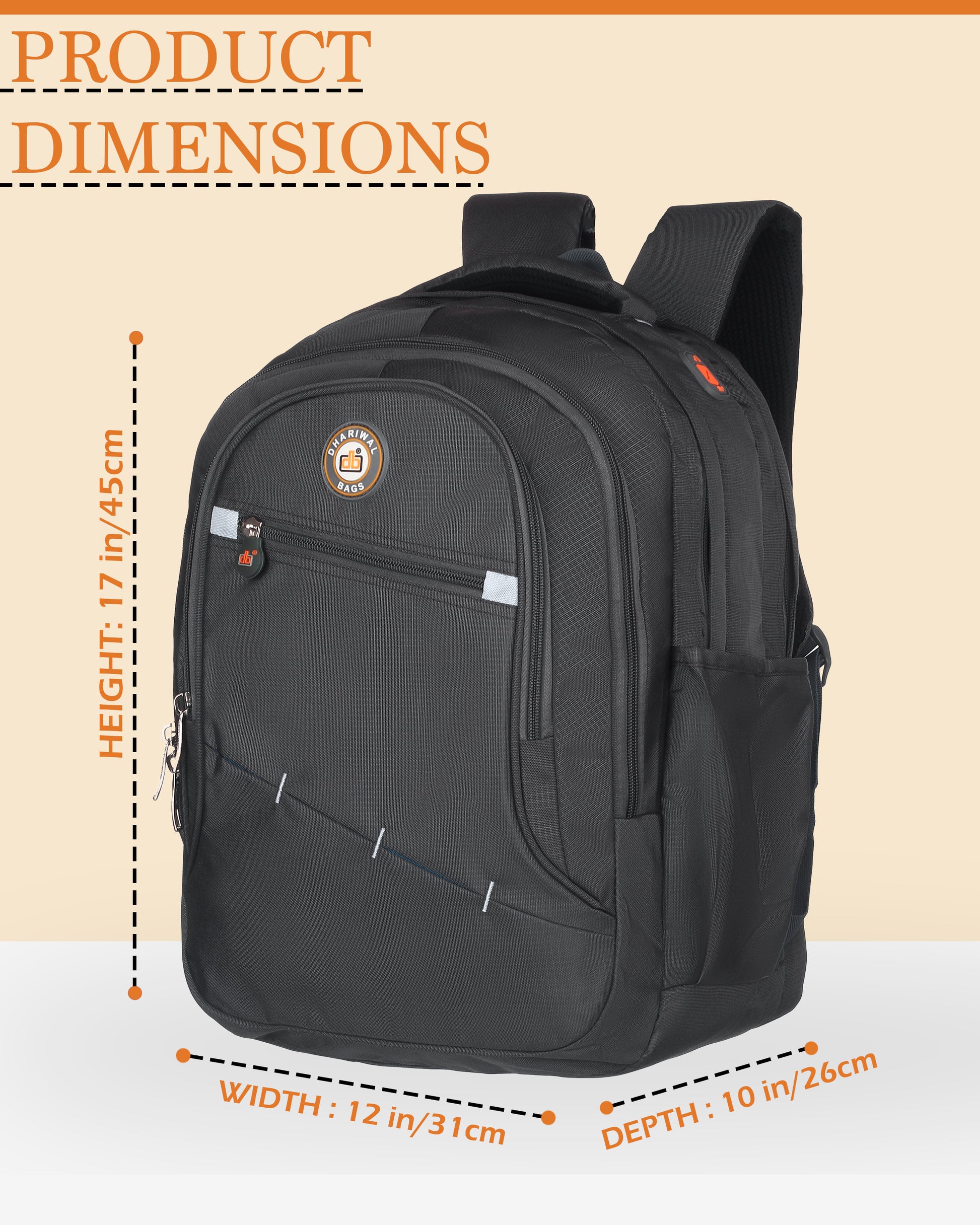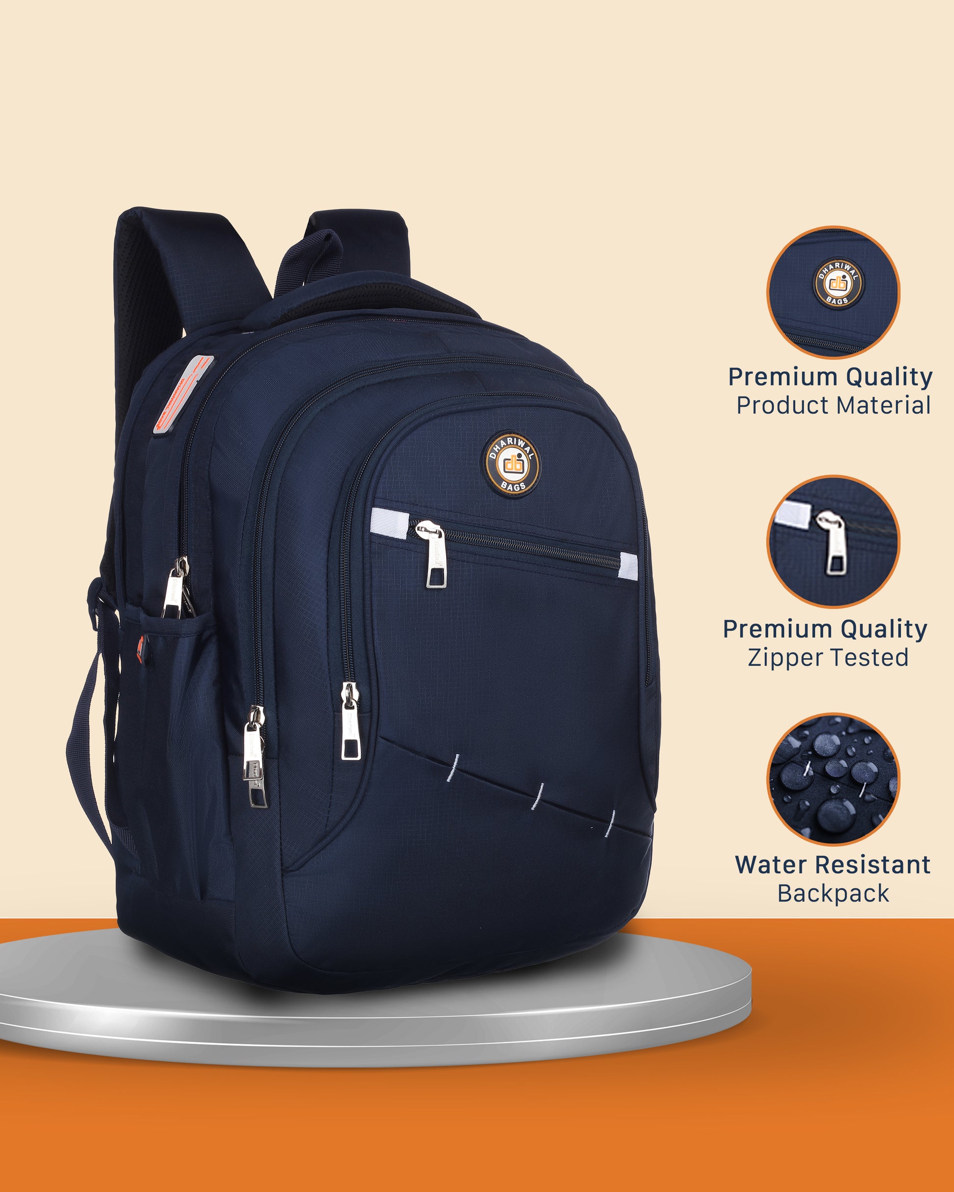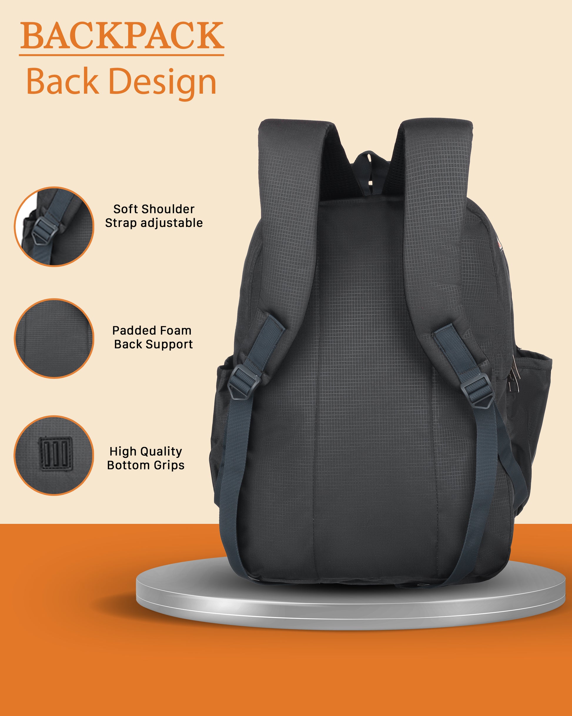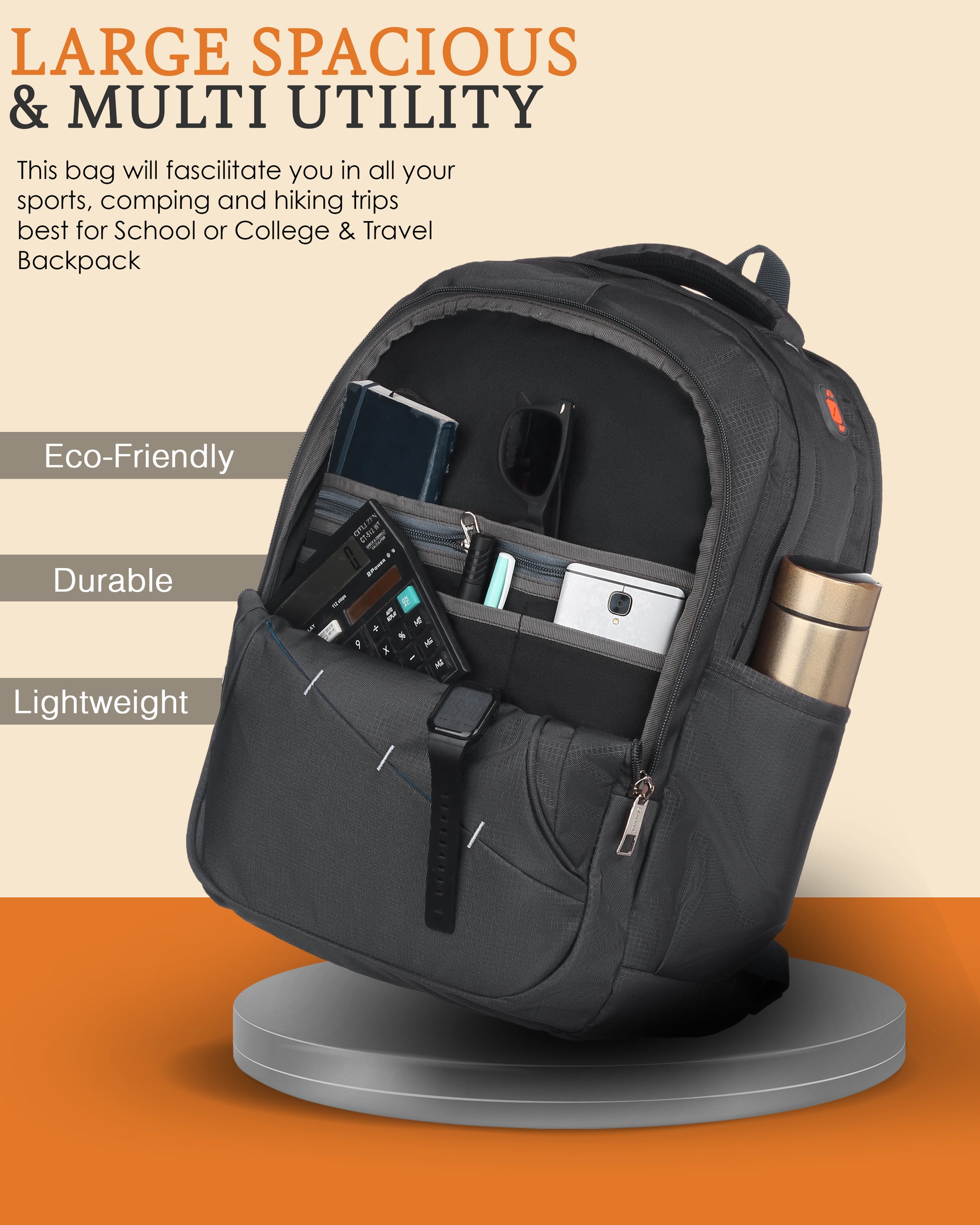 Dhariwal Unisex Dual Compartment Laptop Backpack With Rain Cover 43L BP-253 is Lightweight and spacious laptop backpack with 2 compartments and 3 front easy-access pockets. One compartment is for carrying a laptop inside. Another compartment has an organizer for pens, visiting cards, etc along with space for carrying papers, files, etc. It has provision for holding bottles on both sides and has padded shoulder straps for your comfort.