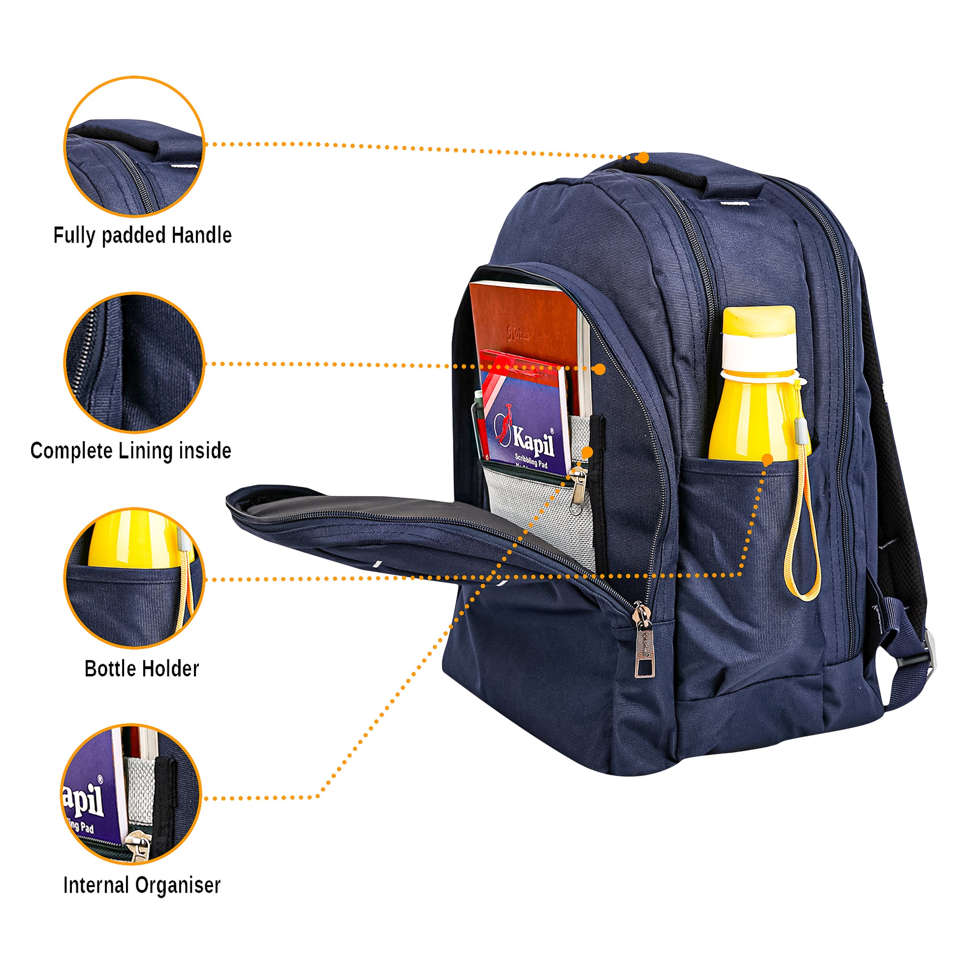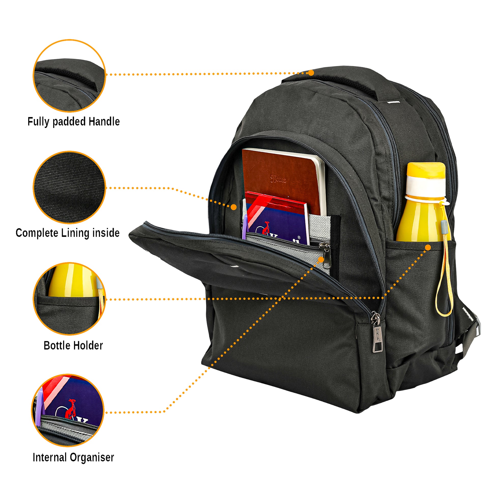 2 कम्पार्टमेंट और 1 सामने आसान पहुंच वाली पॉकेट के साथ हल्का और जगहदार लैपटॉप बैकपैक। एक कंपार्टमेंट लैपटॉप को अंदर ले जाने के लिए है। एक अन्य कम्पार्टमेंट में पेन, विजिटिंग कार्ड आदि के लिए एक आयोजक होता है, साथ ही कागजात, फाइलें आदि ले जाने के लिए जगह होती है। इसमें दोनों तरफ बोतलें रखने का प्रावधान होता है और आपके आराम के लिए गद्देदार कंधे की पट्टियाँ होती हैं।