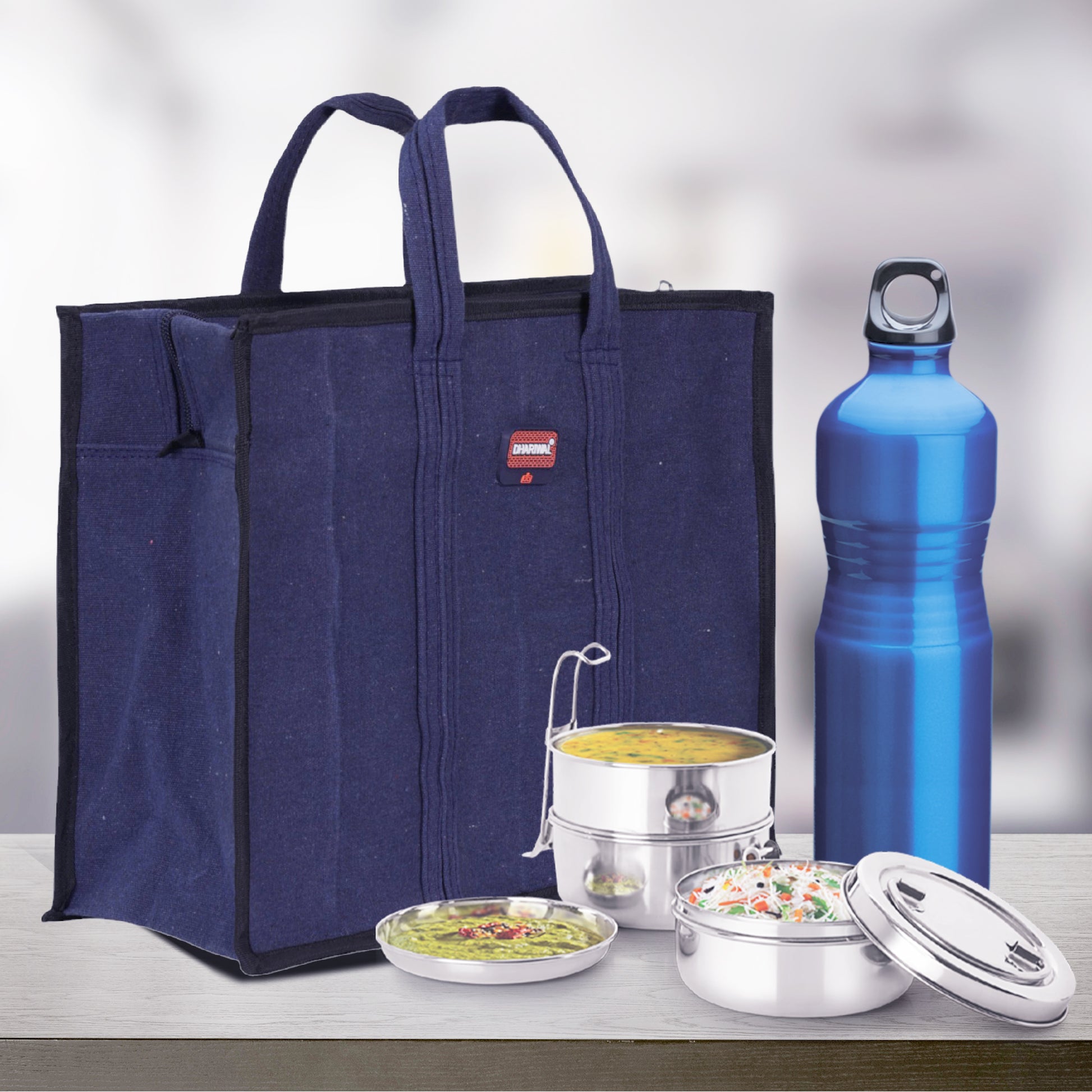 - इस बैग में 3 कम्पार्टमेंट हैं: लंच बॉक्स और पानी की बोतलों के लिए बड़ा कम्पार्टमेंट, चम्मच, कांटा और टिशू पेपर रखने के लिए दूसरा कम्पार्टमेंट, क्वालिटी ज़िपर क्लोज़र, लक्ज़री पैडेड हैंडल और दस्तावेज़, पेन, विज़िटिंग कार्ड आदि के लिए एक और आंतरिक कम्पार्टमेंट। ,