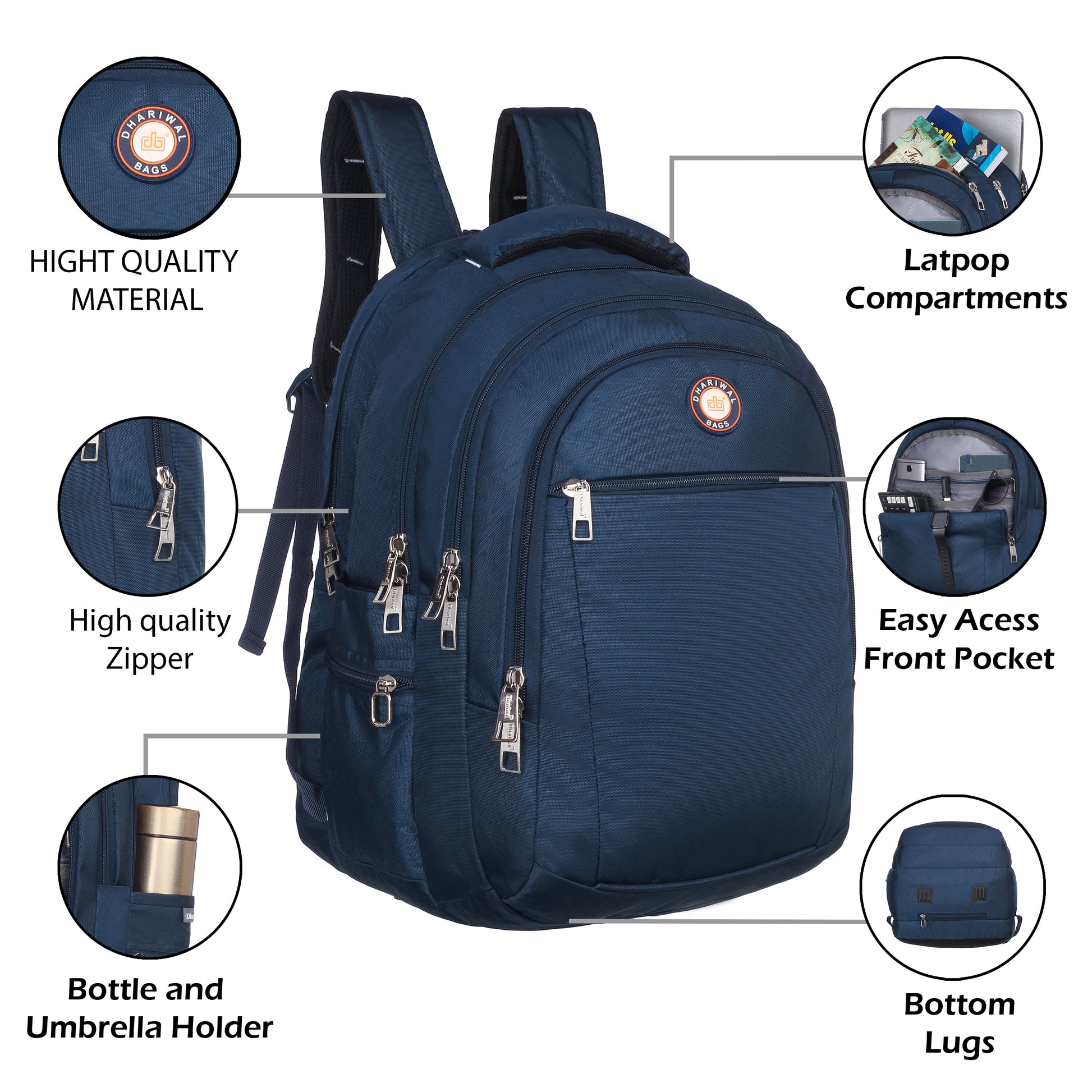 धारीवाल यूनीसेक्स ड्युअल कम्पार्टमेंट लैपटॉप बैकपैक रेन कवर के साथ 51L LB-106 हल्का और जगहदार लैपटॉप बैकपैक है जिसमें 2 कम्पार्टमेंट और 3 सामने आसानी से पहुंचने वाली पॉकेट हैं। एक कंपार्टमेंट लैपटॉप को अंदर ले जाने के लिए है। एक अन्य कम्पार्टमेंट में पेन, विजिटिंग कार्ड आदि के लिए एक आयोजक होता है, साथ ही कागजात, फाइलें आदि ले जाने के लिए जगह होती है। इसमें दोनों तरफ बोतलें रखने का प्रावधान होता है और आपके आराम के लिए गद्देदार कंधे की पट्टियाँ होती हैं।