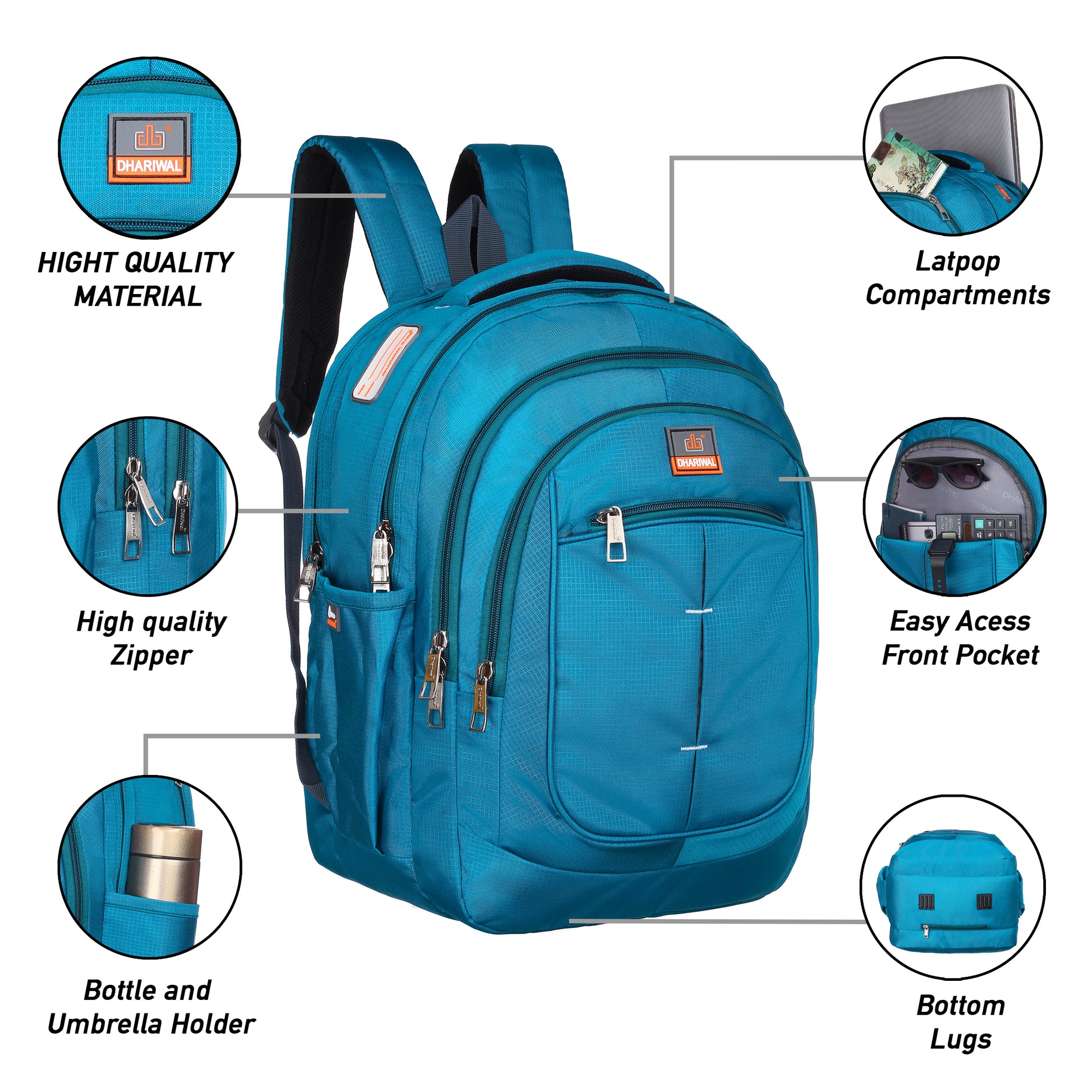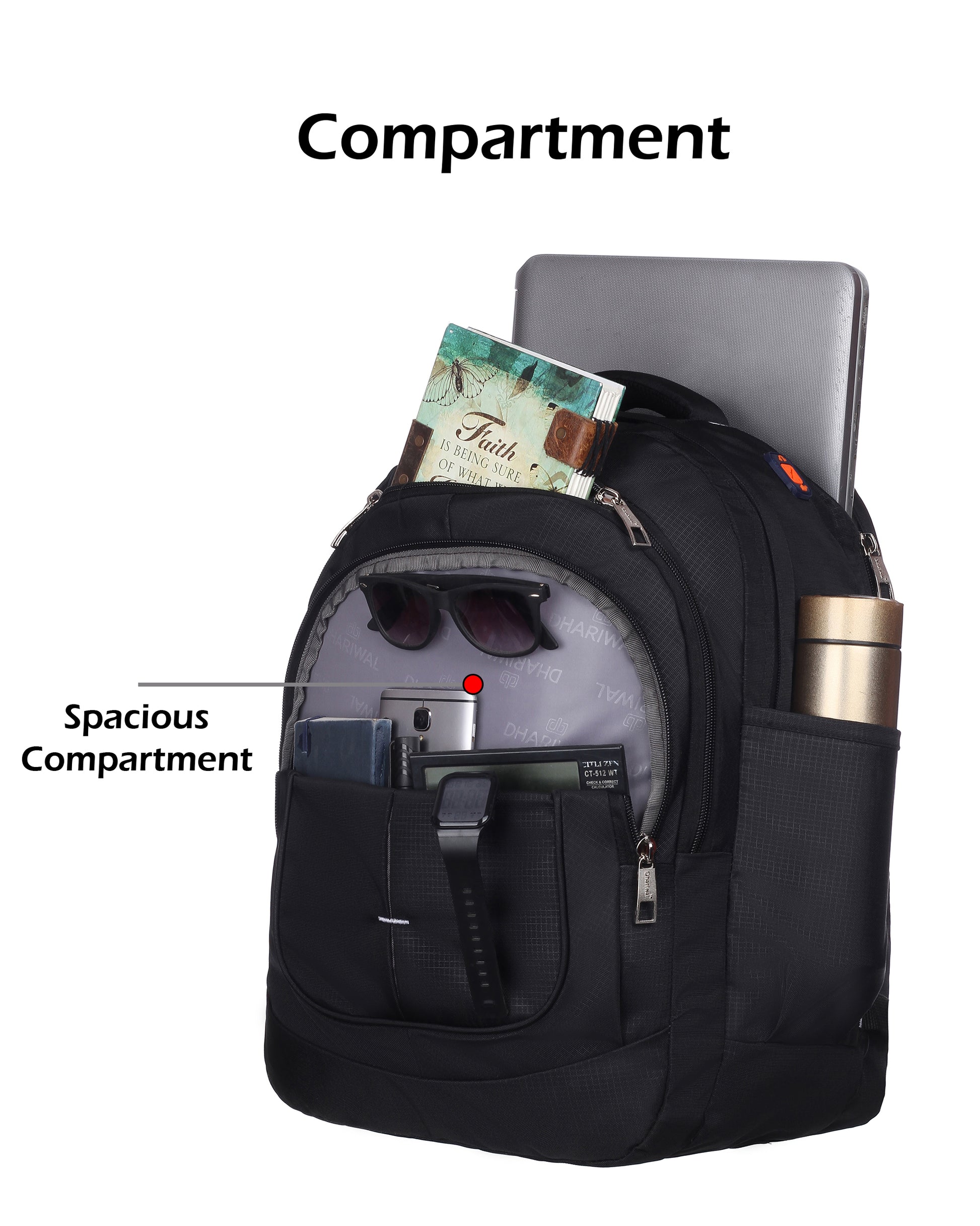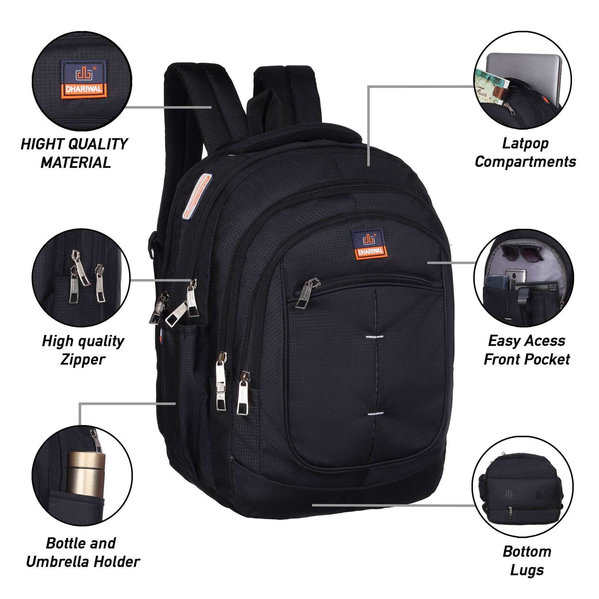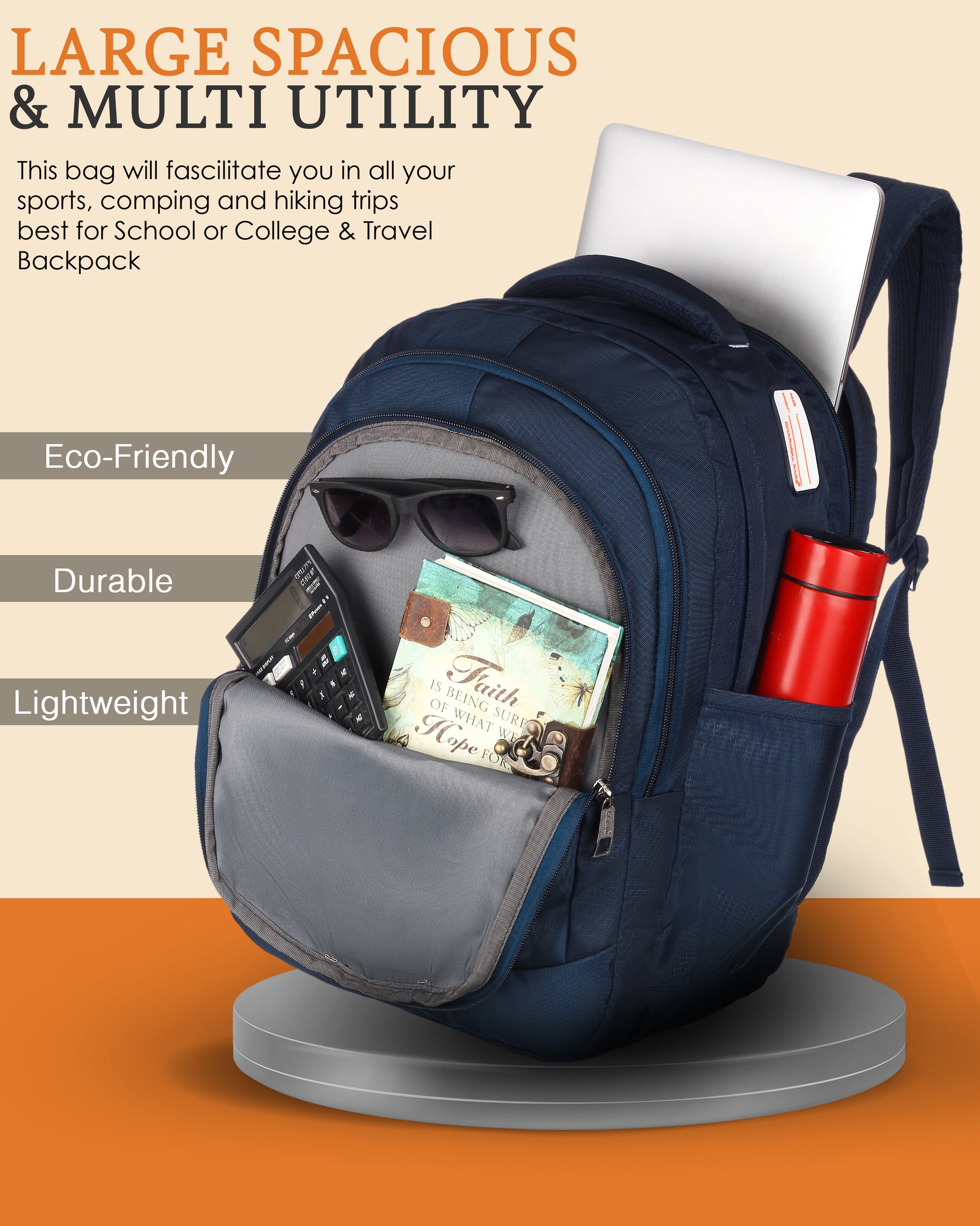 2 कम्पार्टमेंट + 3 अतिरिक्त फ्रंट पॉकेट, ईयरफोन वायर स्लॉट, 2 पानी की बोतल स्लॉट और उच्च गुणवत्ता वाले पॉलिएस्टर से बने 1 आंतरिक निजी पॉकेट के साथ कॉलेज/ऑफिस/कैजुअल के लिए बैकपैक।