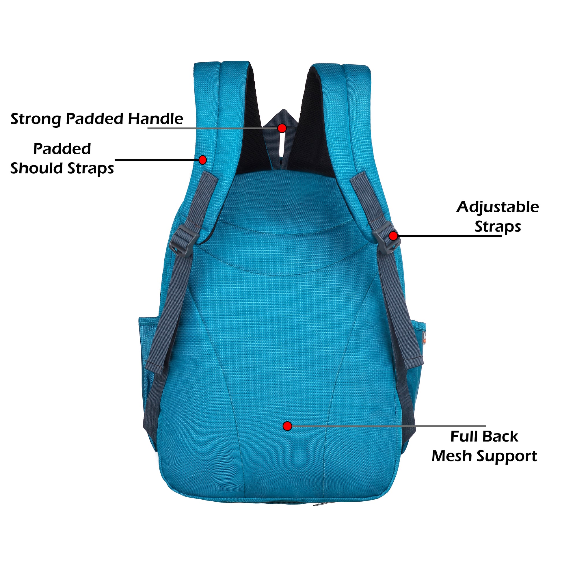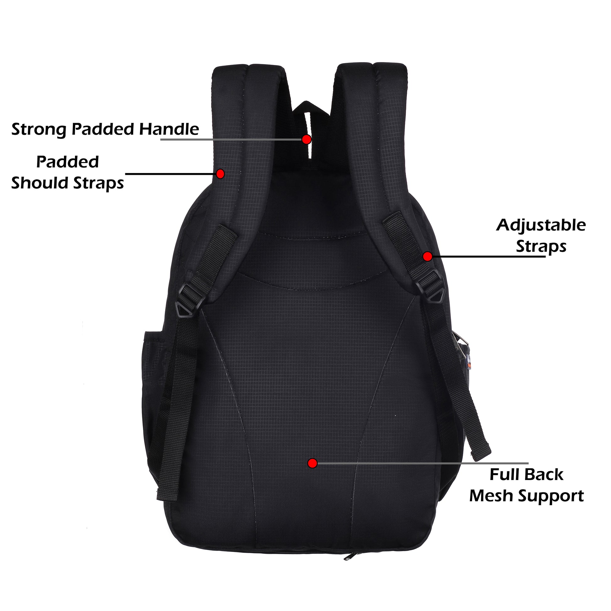 - साइड पॉकेट्स: दोनों तरफ 2 टिकाऊ इलास्टिक मेश पॉकेट्स में पानी की बोतलें, छोटी कॉम्पैक्ट छतरी और अन्य सामान फिट होते हैं