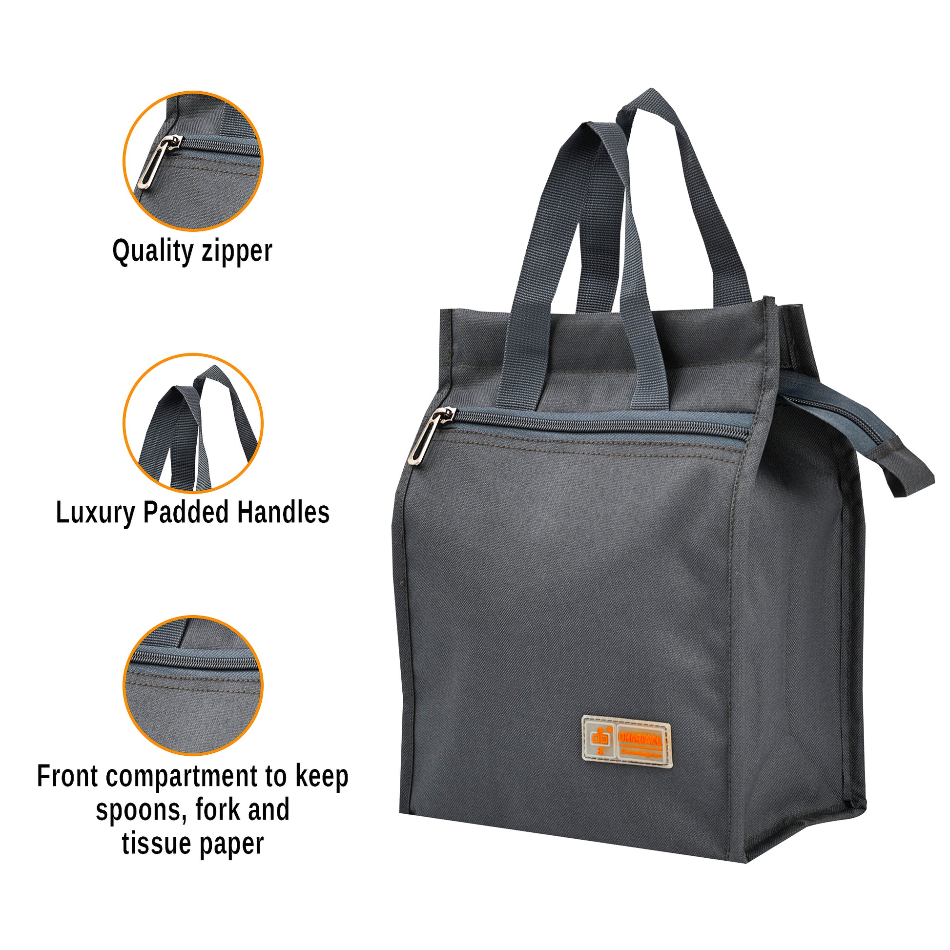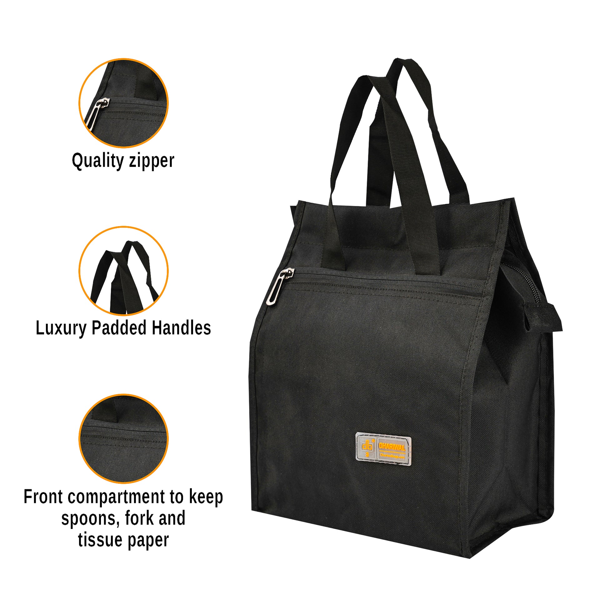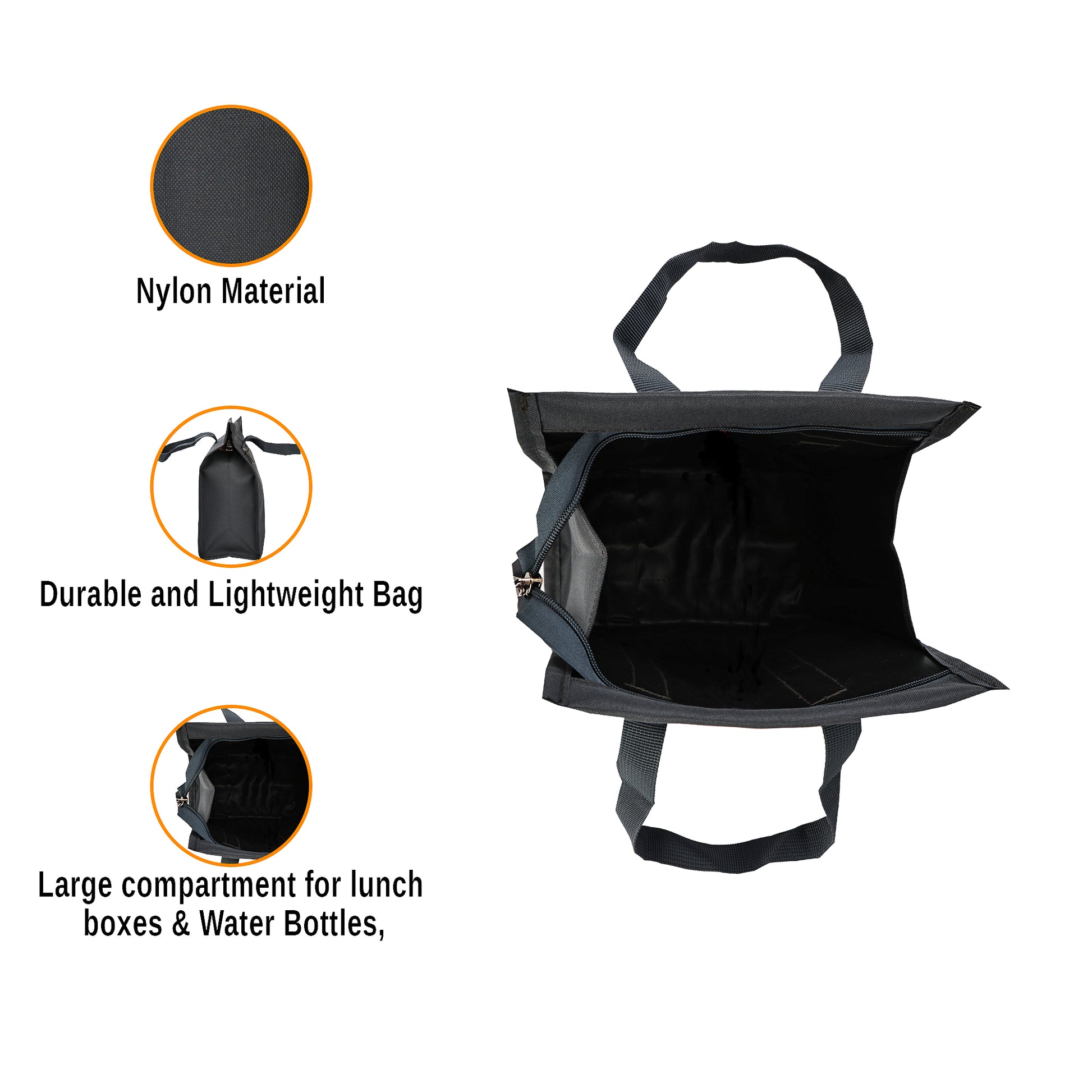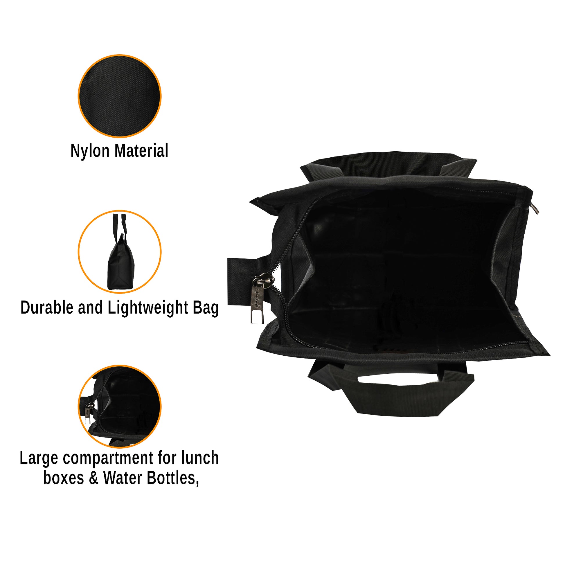 - इस बैग में 2 कम्पार्टमेंट हैं: 1 लंच बॉक्स और पानी की बोतलों के लिए बड़ा कम्पार्टमेंट, चम्मच, फोर्क और टिशू पेपर रखने के लिए दूसरा कम्पार्टमेंट, क्वालिटी ज़िपर क्लोज़र, लक्ज़री पैडेड हैंडल