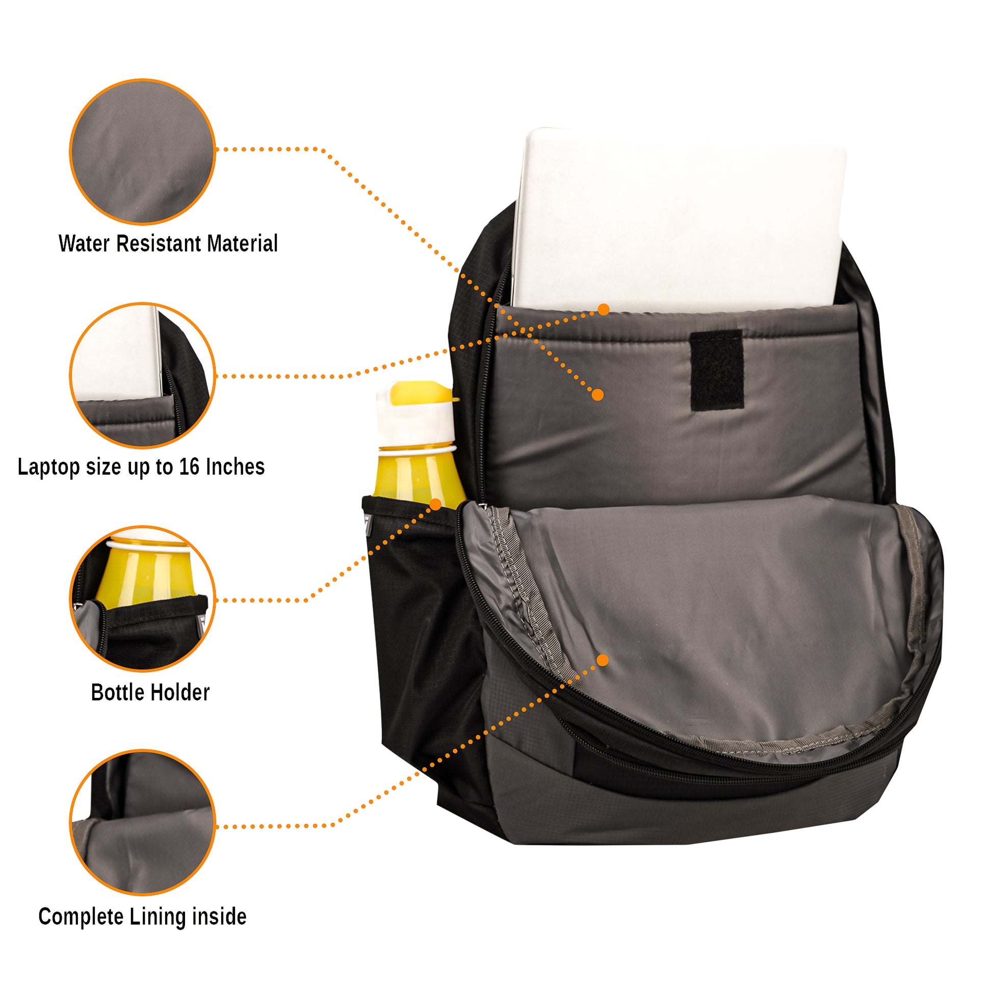 Lightweight and spacious laptop backpack with 2 compartments and 1 front easy-access pockets. One compartment is for carrying a laptop inside and also carry some books . Another compartment has to carry for cloth, books, file etc with space for carrying papers, files, etc. And the main pocket has to carry pens, visiting cards, etc along with it. It has provision for holding bottles on one sides and has two long padded shoulder straps for your comfort.