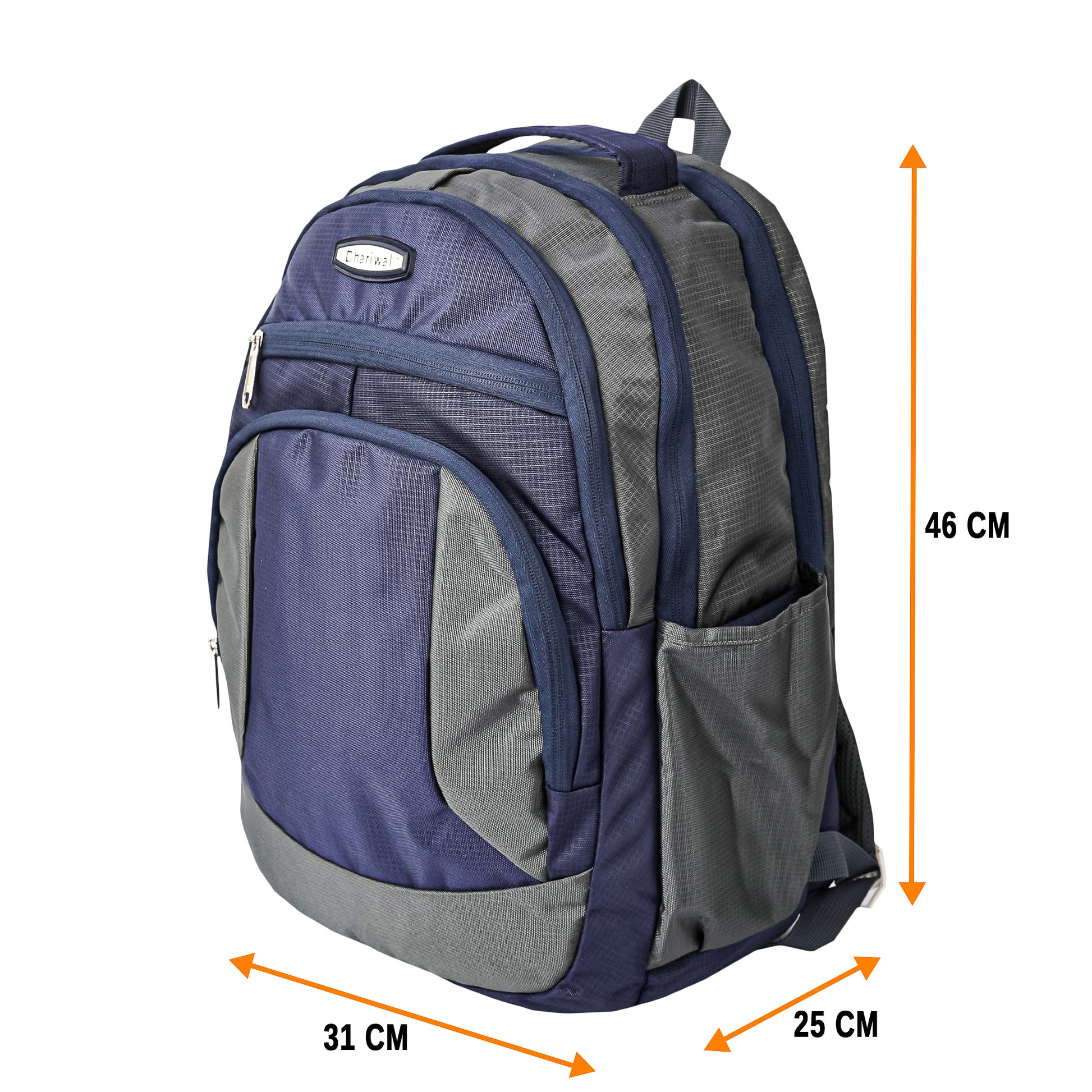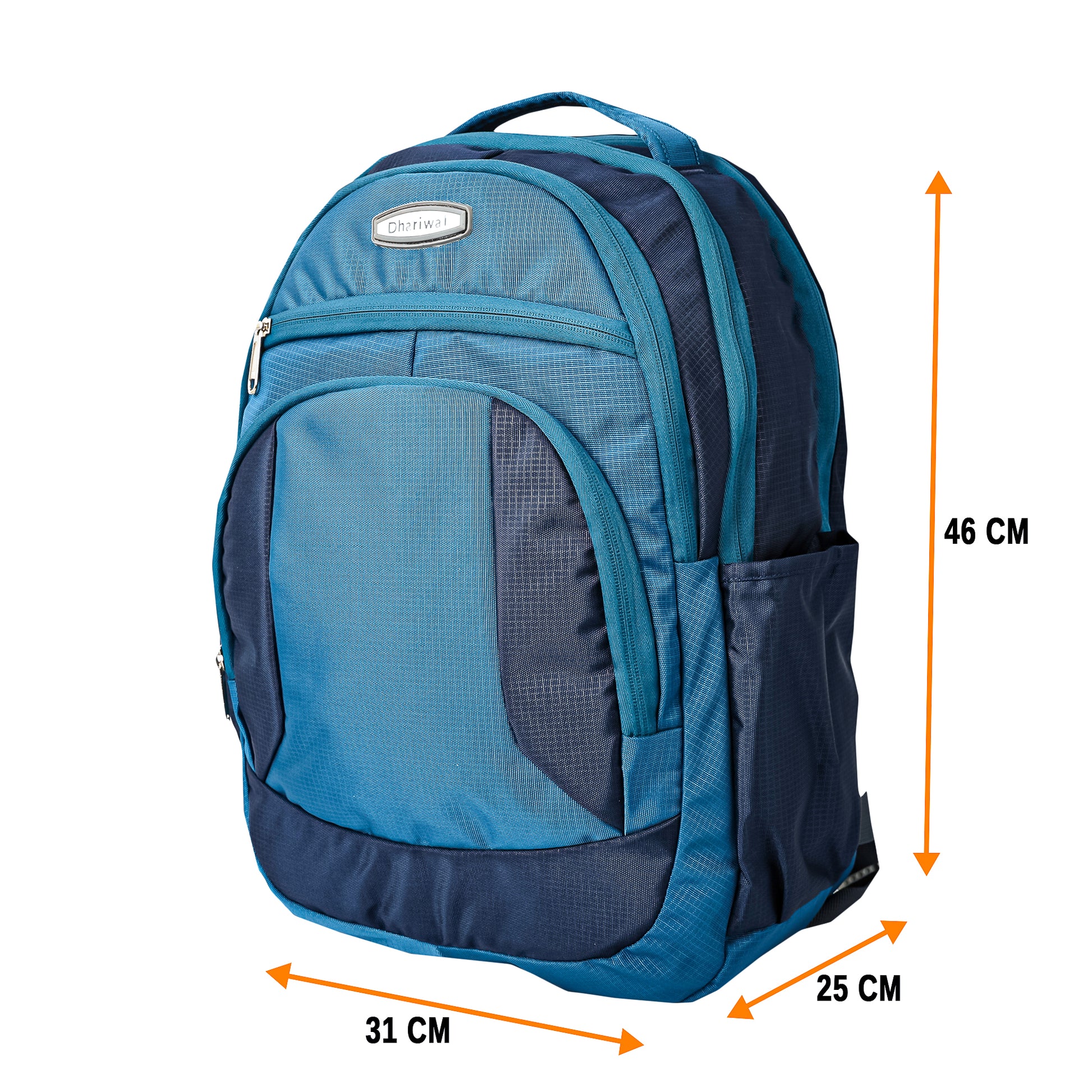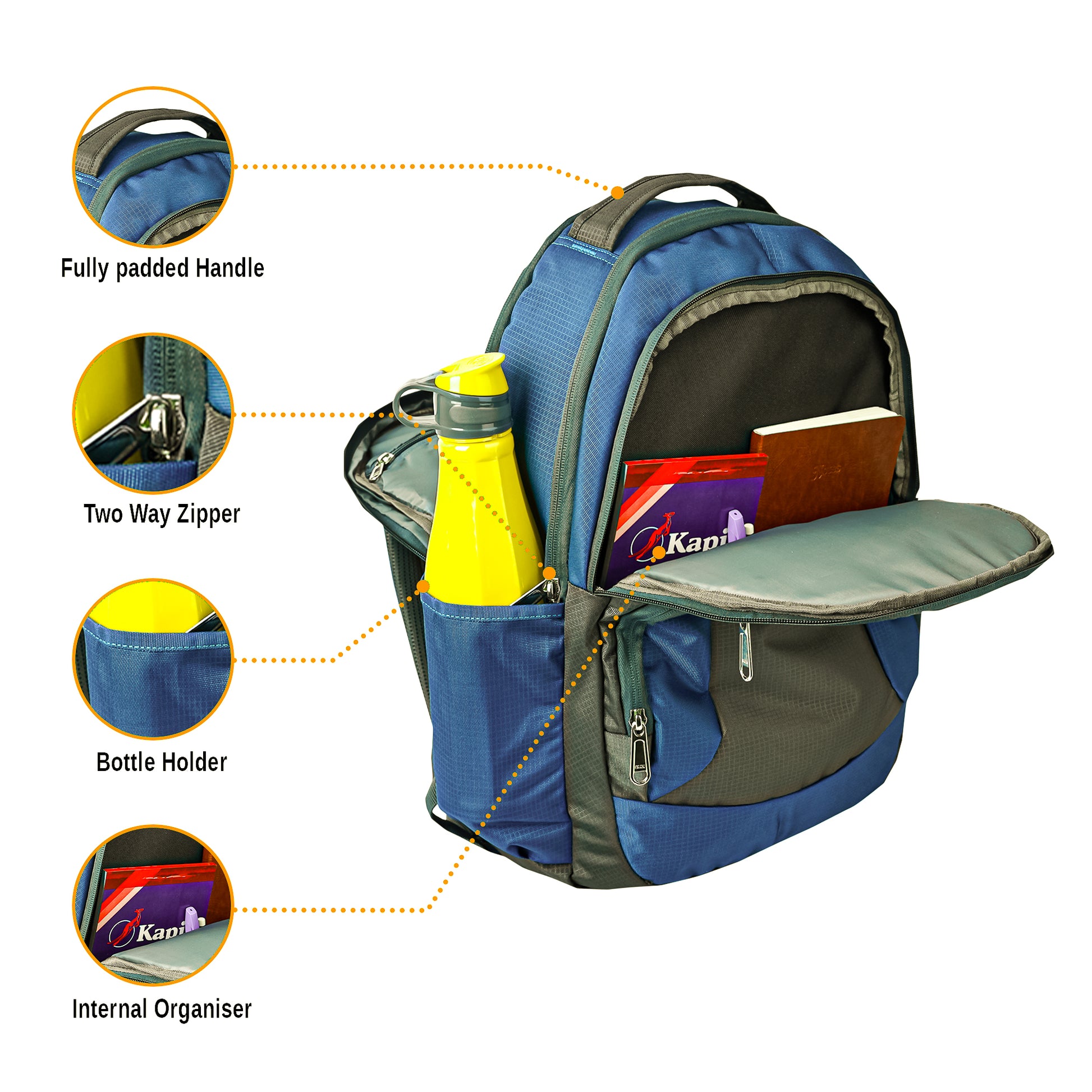 Backpack for College/Office/Casual with 3 Main Compartments + 2 Extra Front Pockets, 2 Water Bottle Slots Both Side and 2 internal private pockets in main Compartments with heavy zipper made from high quality Polyester.