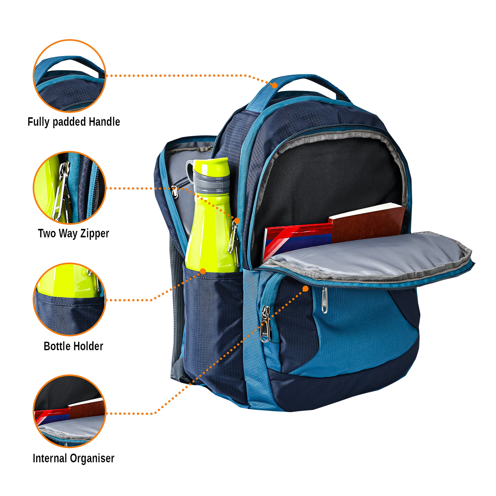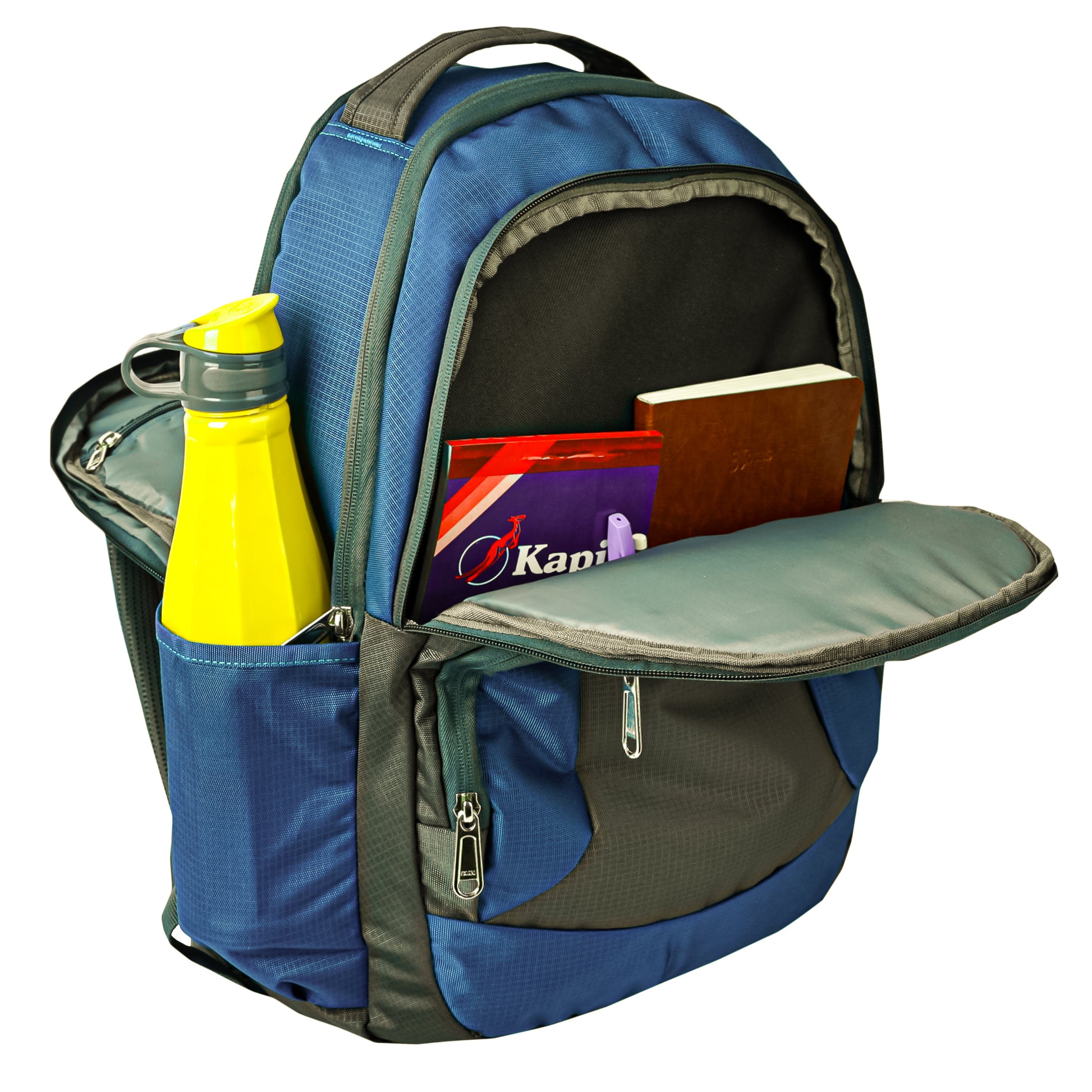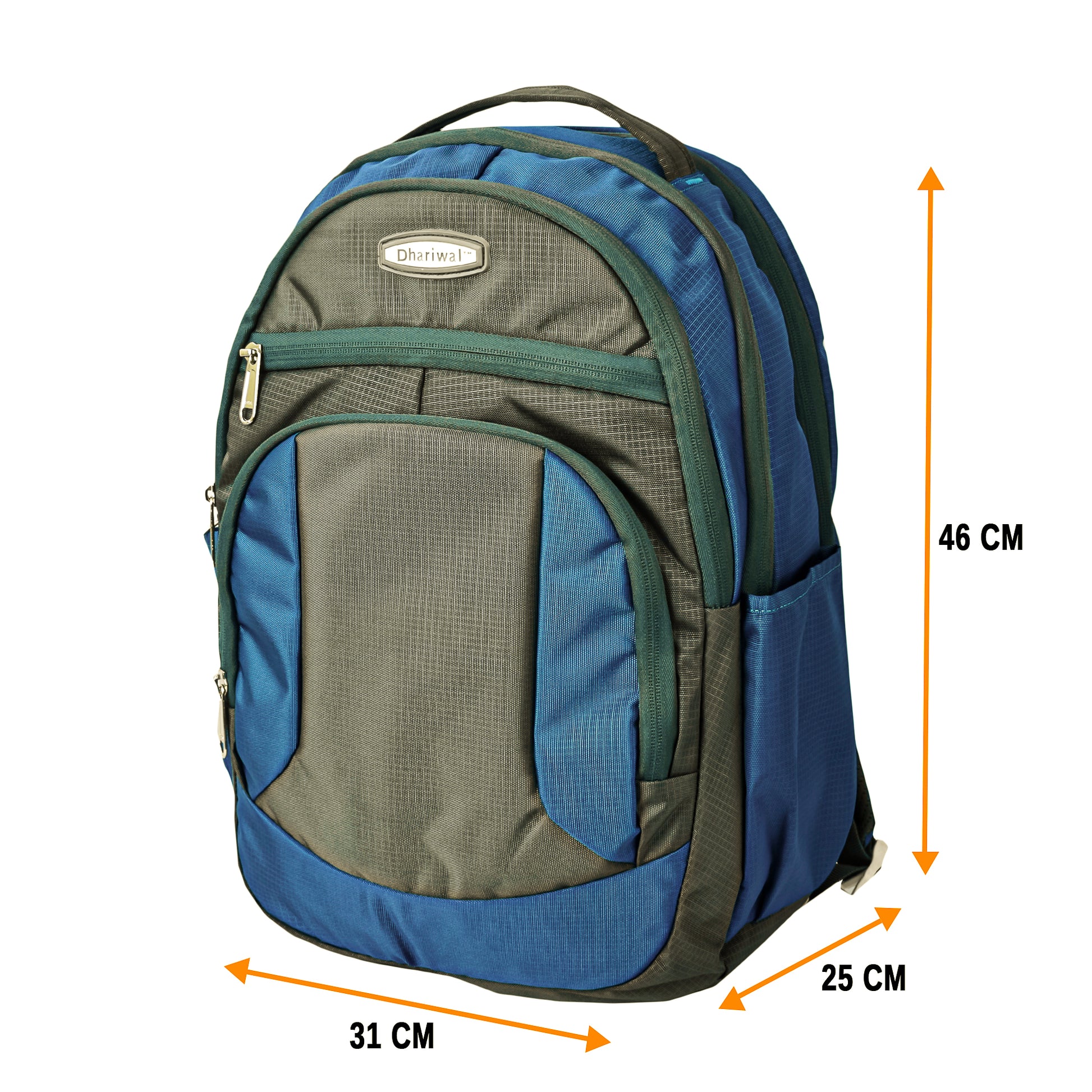 Backpack for College/Office/Casual with 3 Main Compartments + 2 Extra Front Pockets, 2 Water Bottle Slots Both Side and 2 internal private pockets in main Compartments with heavy zipper made from high quality Polyester.
