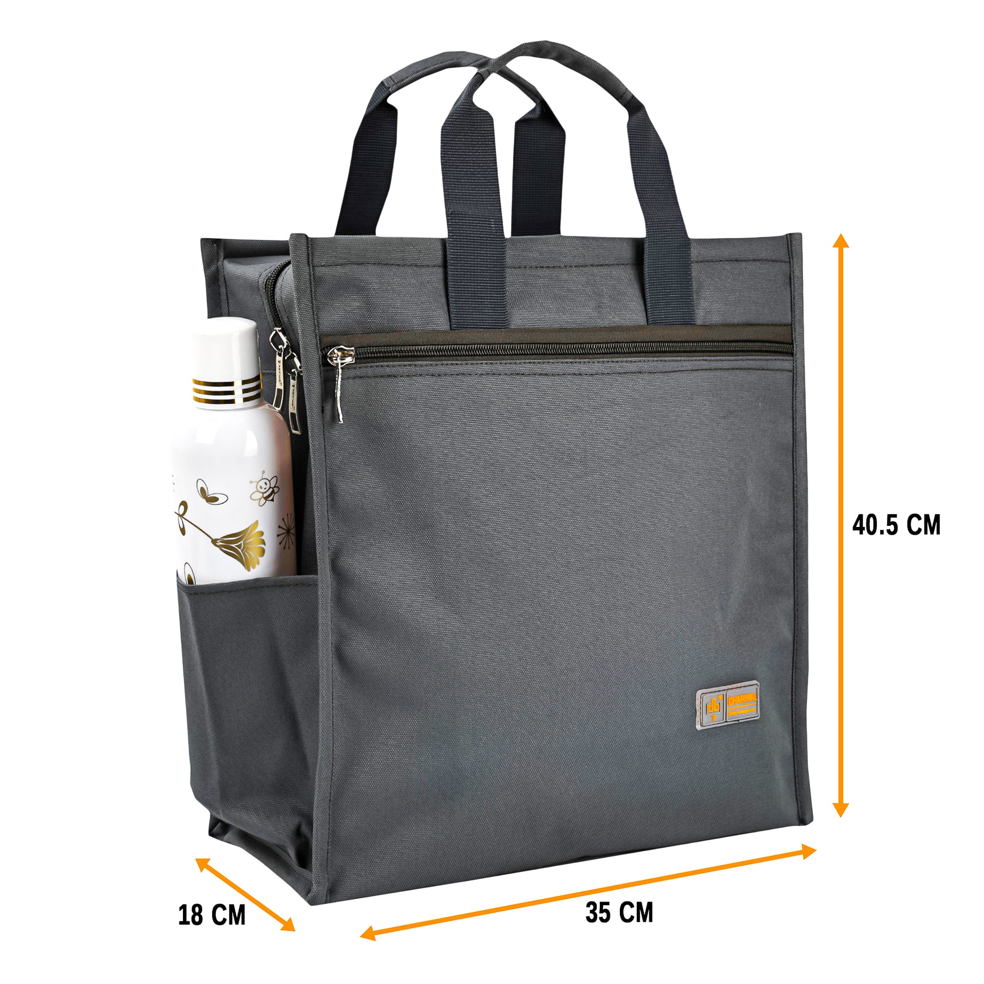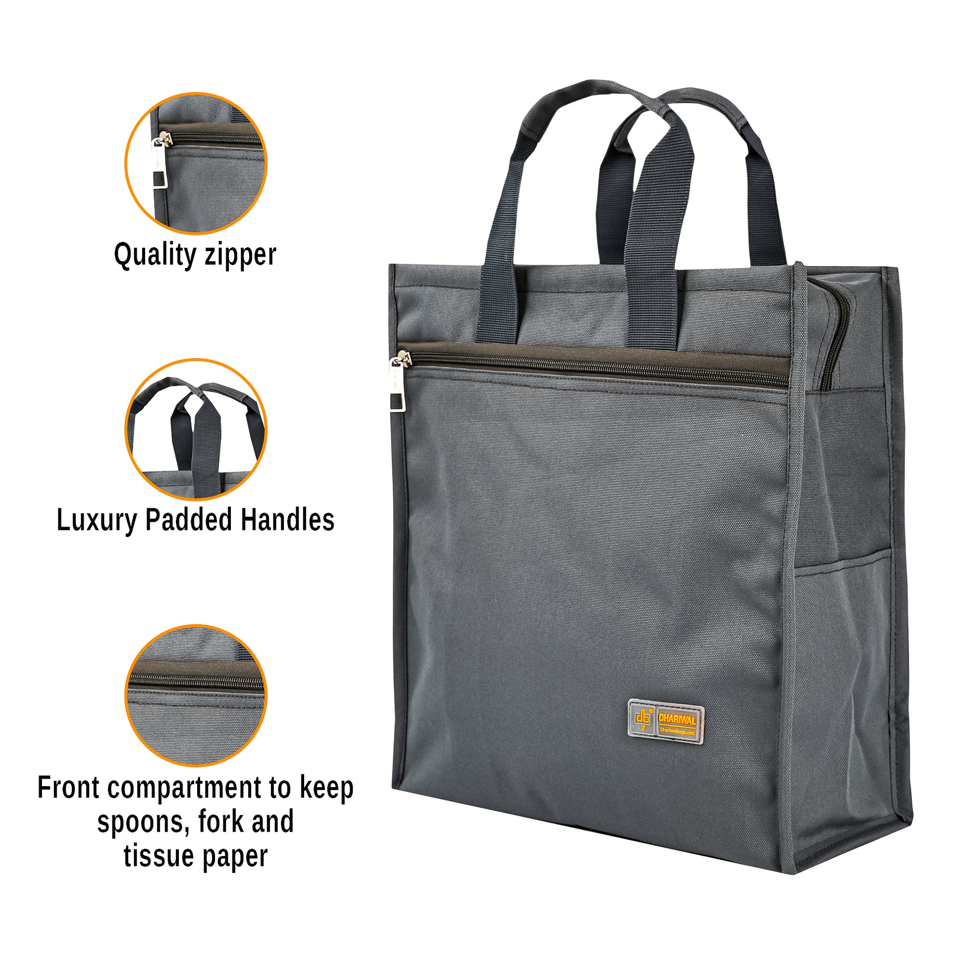 - This bag has 3 compartments: 1 of the large compartment for lunch boxes & Water Bottles, 2nd compartment to keep spoons, fork and tissue paper, Quality zipper closure, Luxury Padded Handles and another internal compartment for documents, pens, visiting cards, etc.,