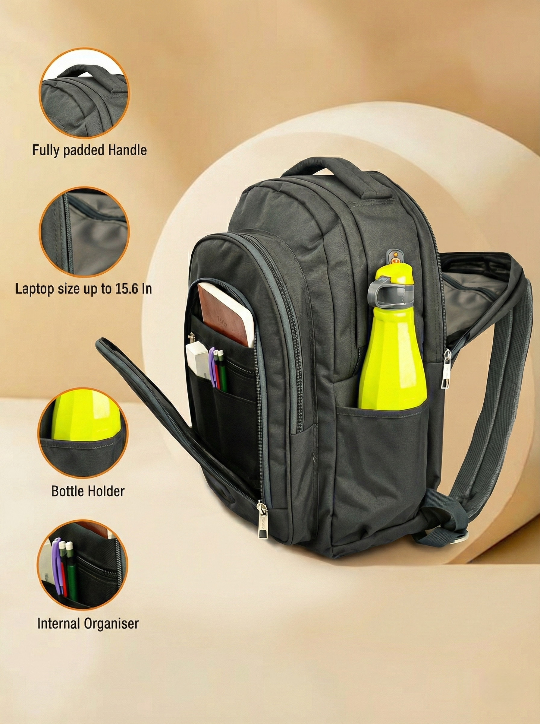 Compartments:- 3 main + 1 front organizer pocket + 2 side bottle holder