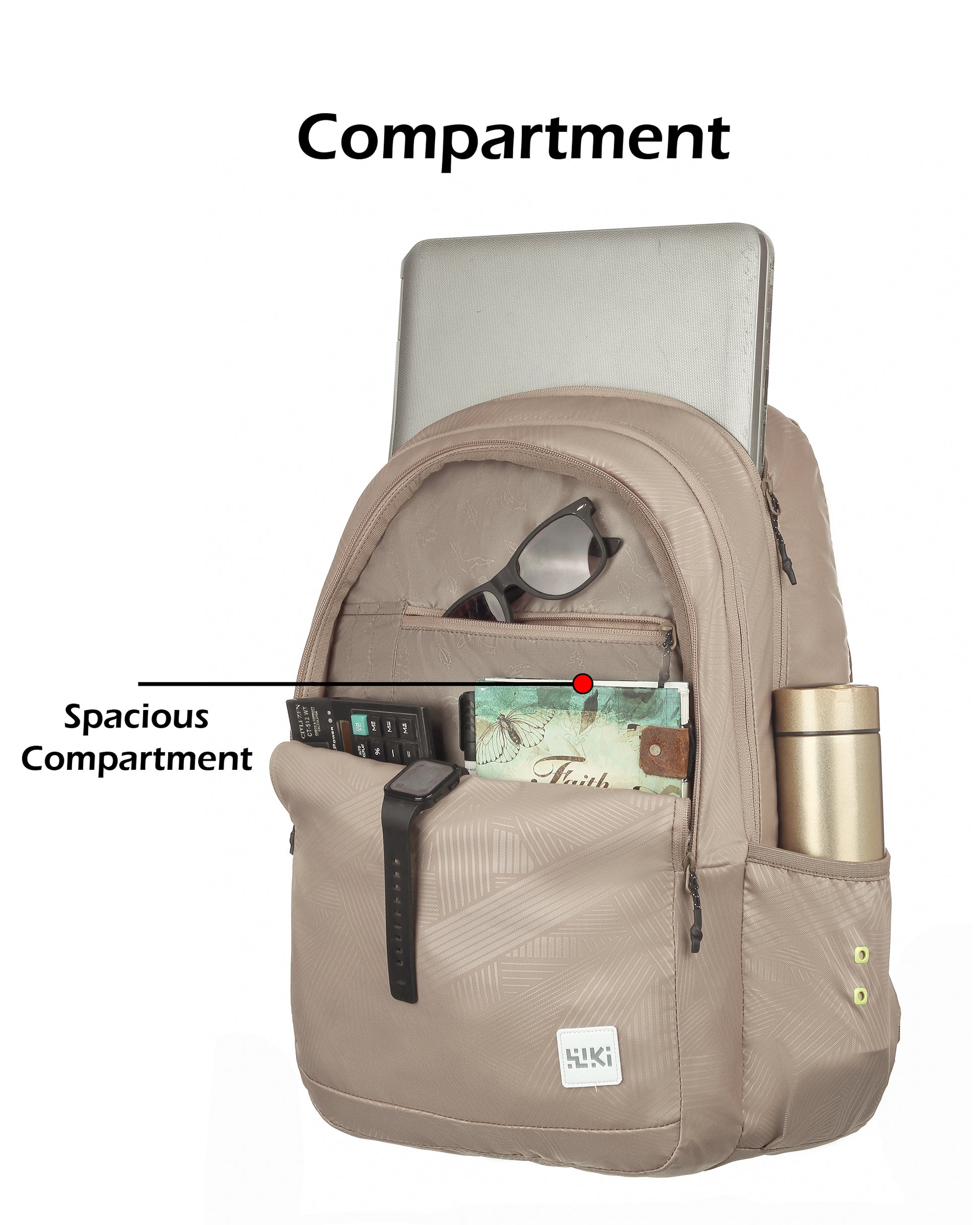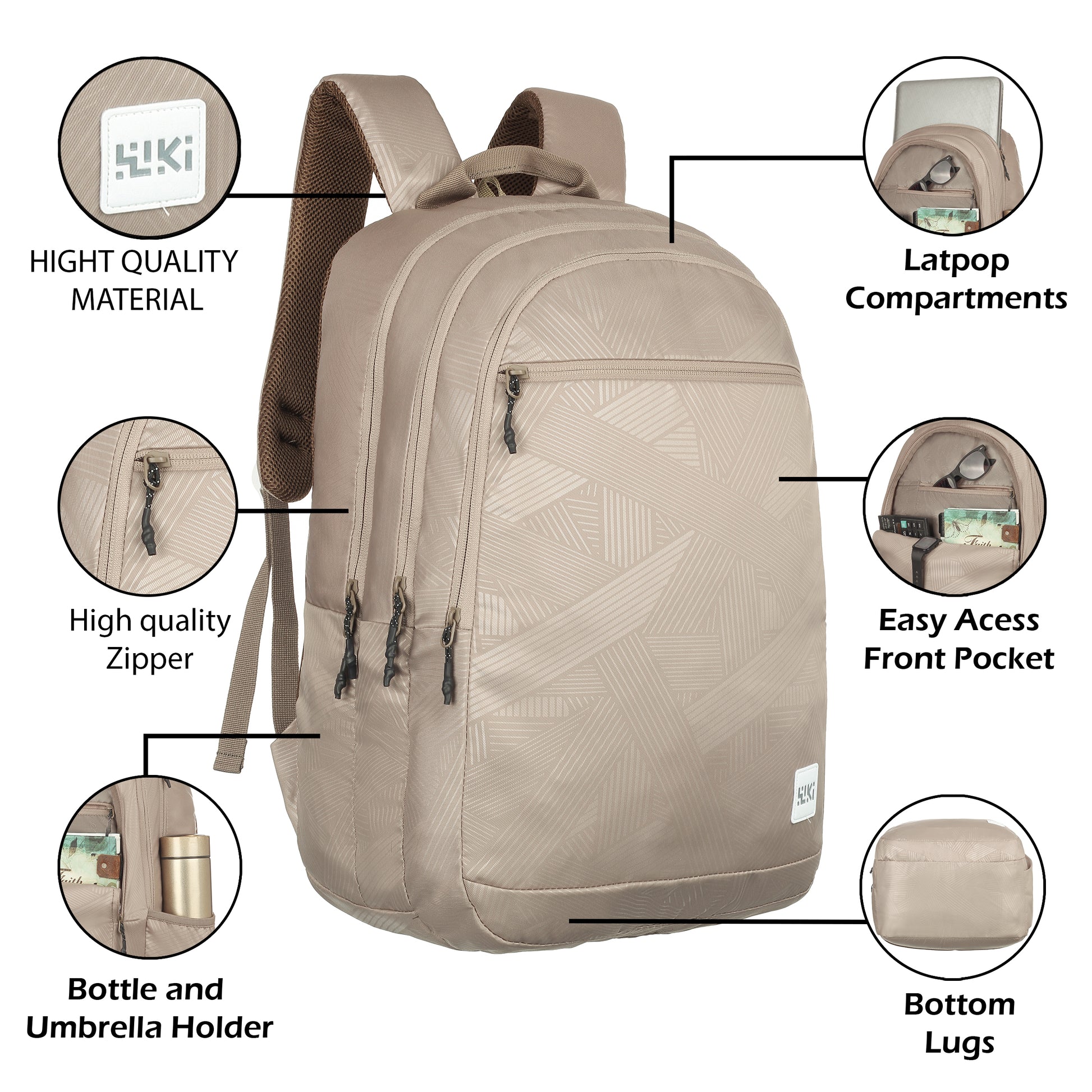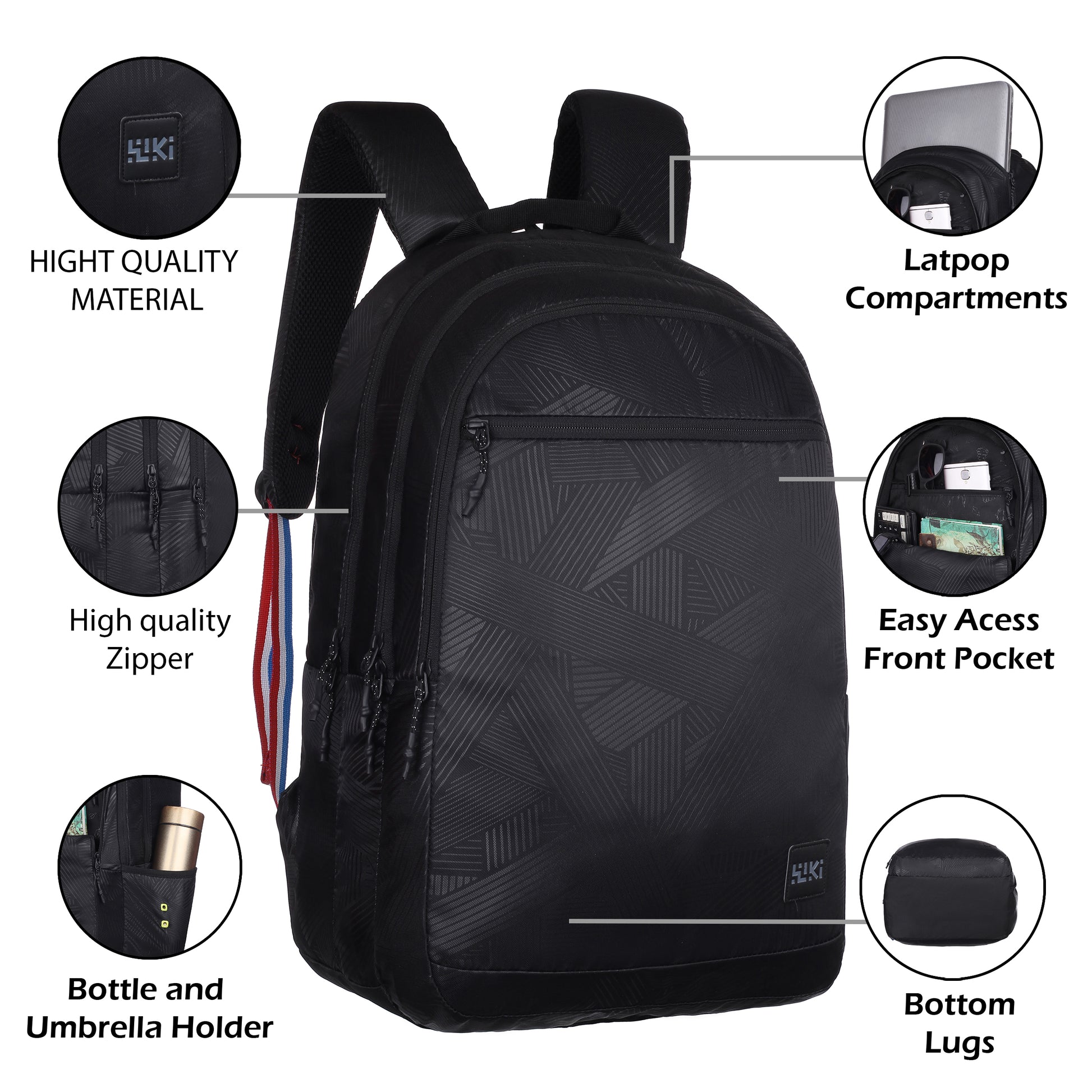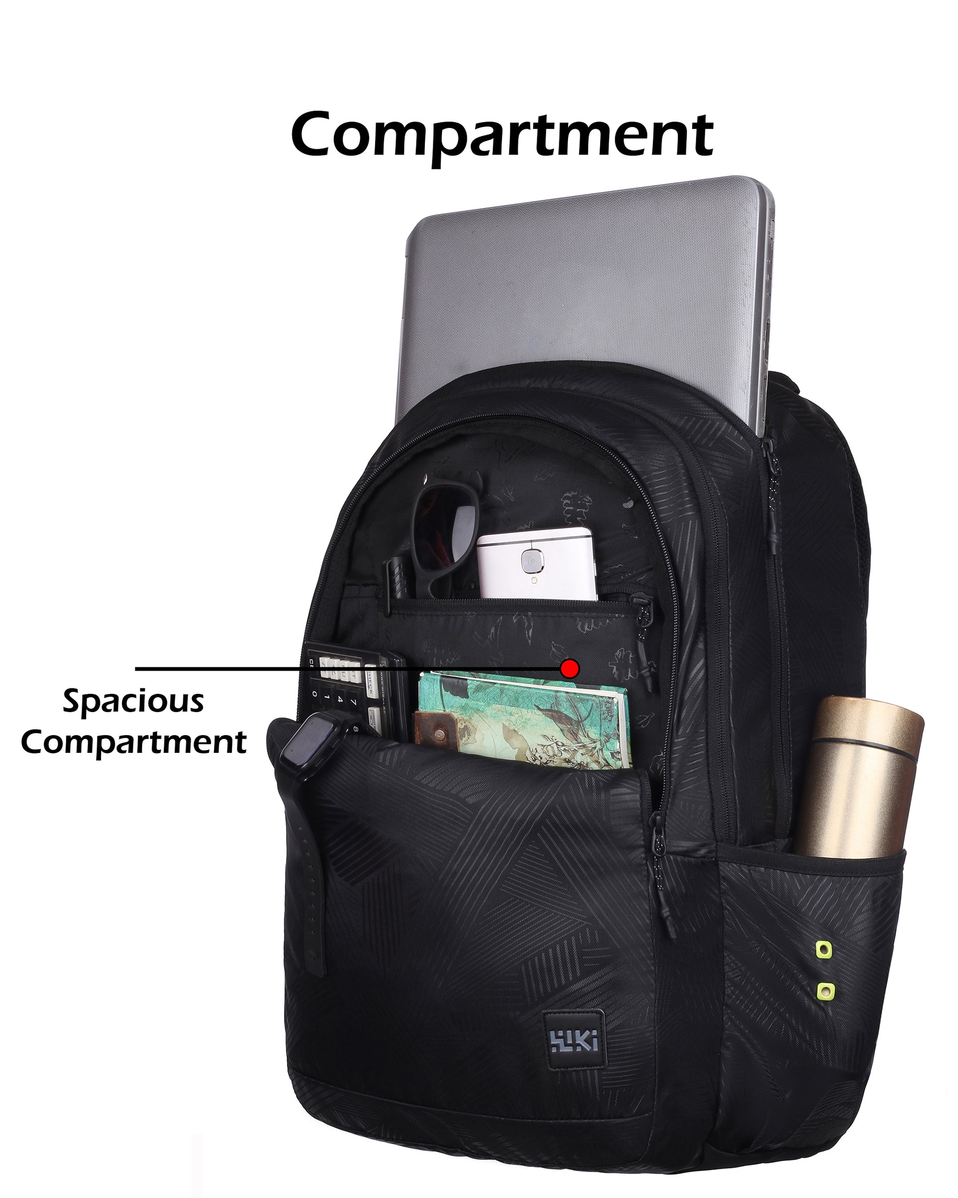 Three compartments for better organisation, side fabric pocket for carrying a bottle, padded back system for better back support, padded shoulder straps for comfort and ease of carrying, quick-grab haul loop, multi-level organiser for storing accessories, sleeve separator, lining separator for better organisation inside the compartment. Outer Material: Polyester, Color: Black and Mel, Ideal For: Men & Women Water Resistance: Water resistant; Dimensions: 27 cms x 34 cms x 48 cms (LxWxH) Number of compartments: 3; Laptop Compatibility: Yes, Target Audience: Unisex Age Range Description: Adult; Closure Type: Zipper; Special Features: Laptop Compartment; Pocket Description: Utility Pocket
